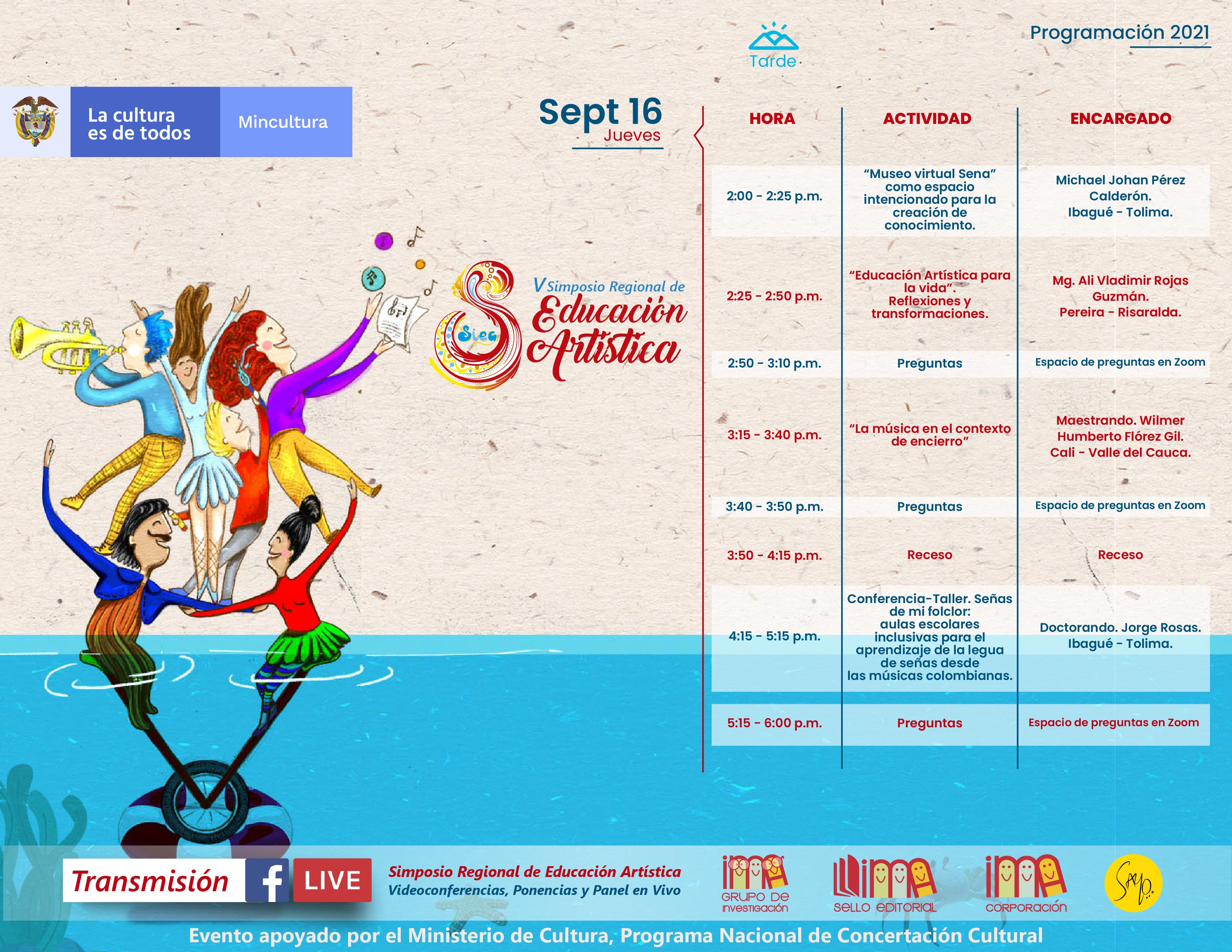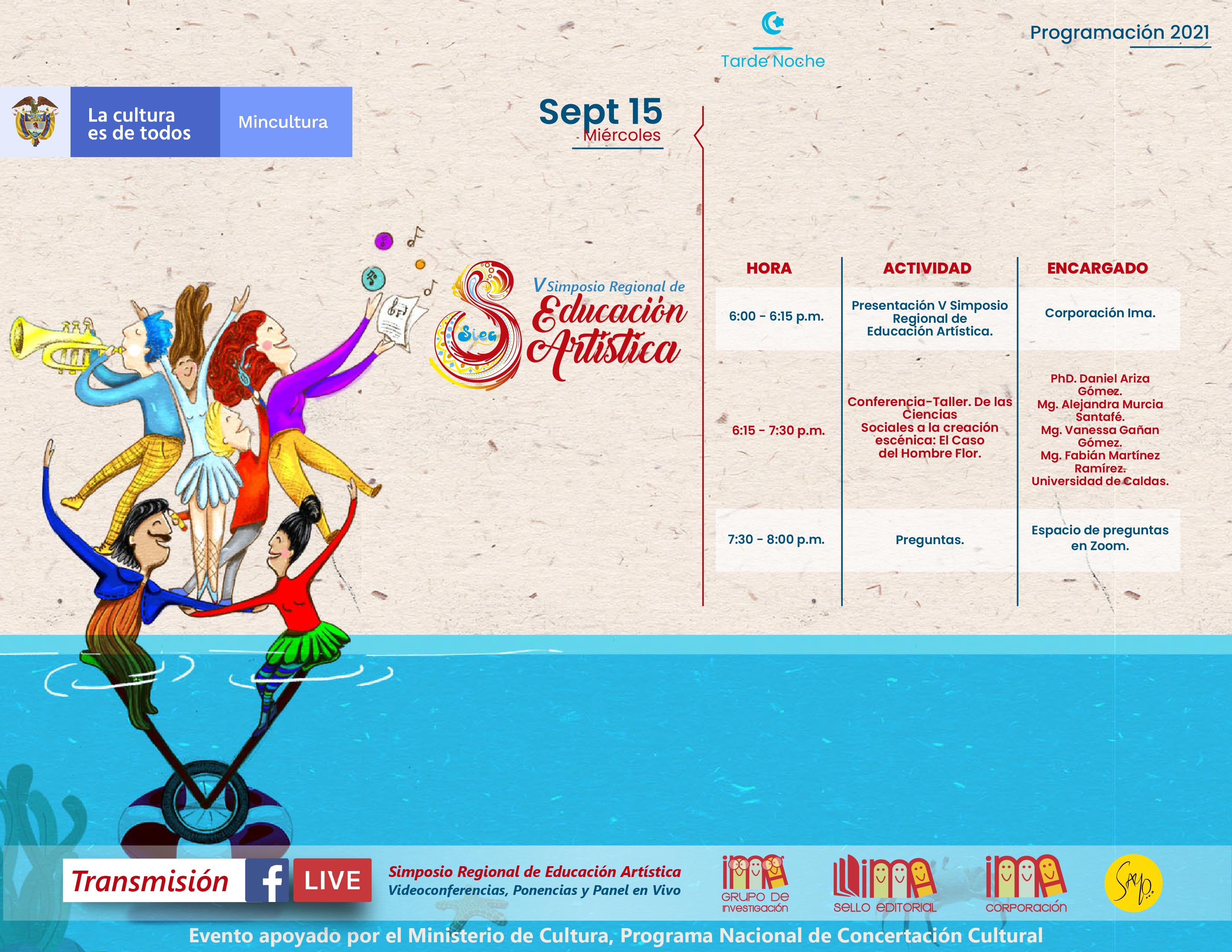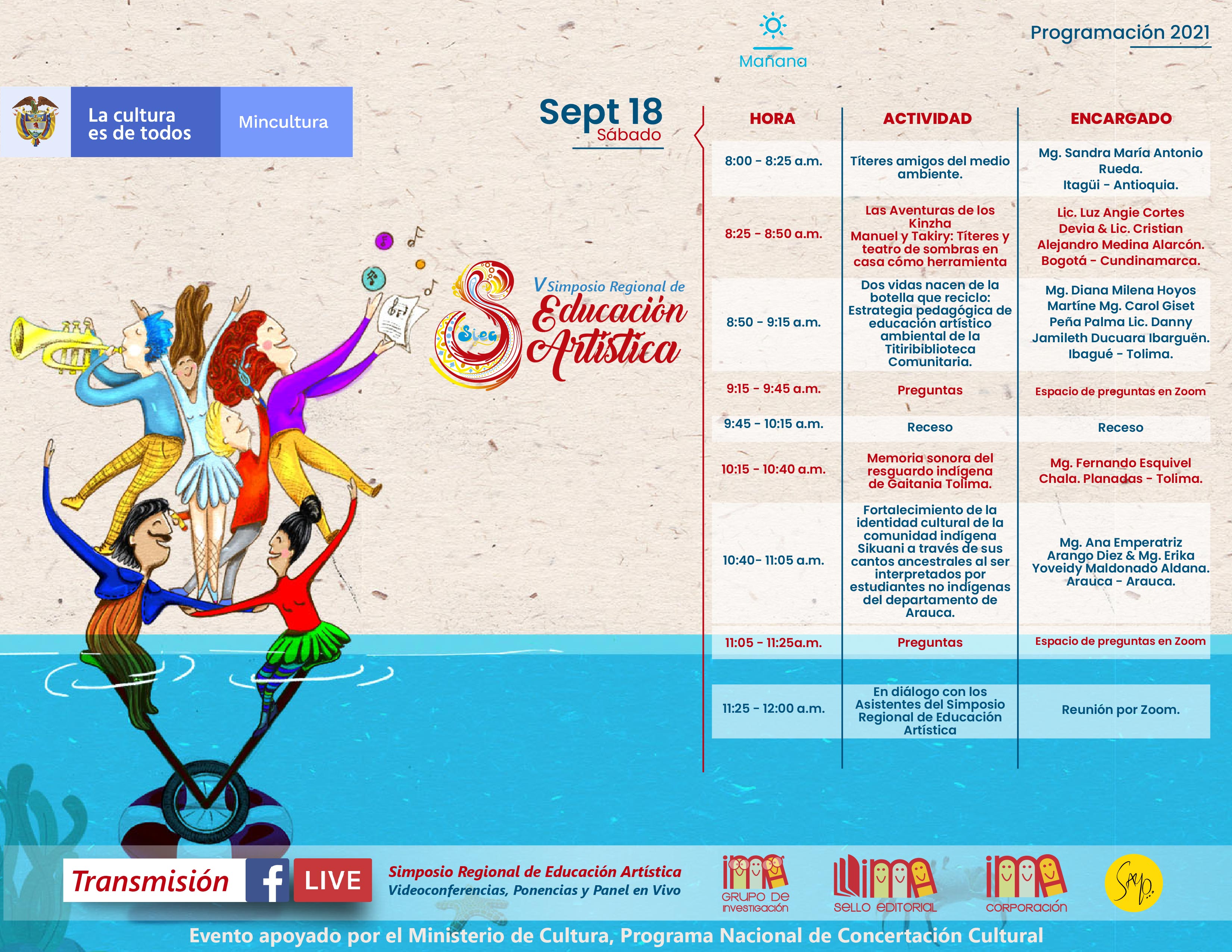 La Corporación Ima, el Programa Nacional de Concertación Cultural del Ministerio de Cultura, y el grupo de Investigación IMA, realizaron el V Simposio Regional de Educación Artística de manera virtual, los días 15, 16, 17 y 18 de septiembre de 2021.