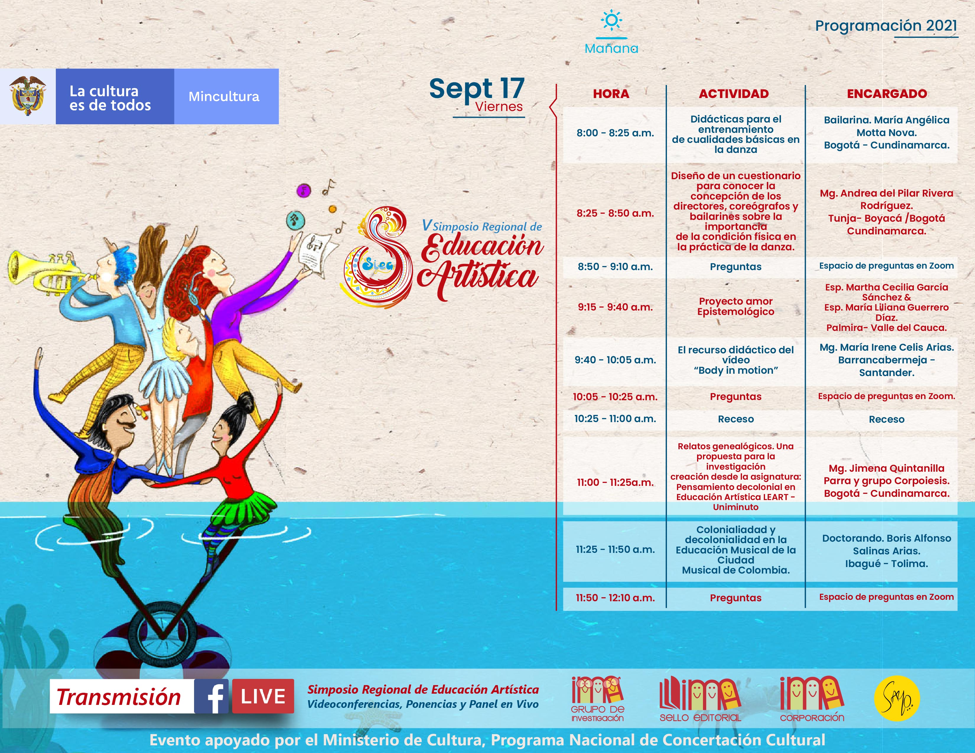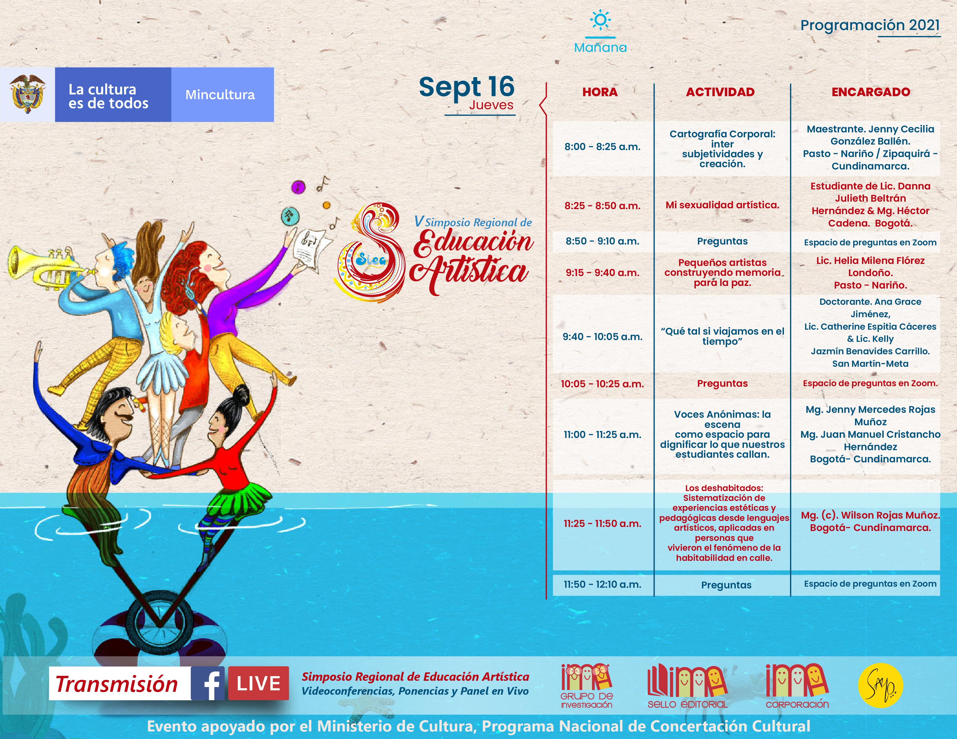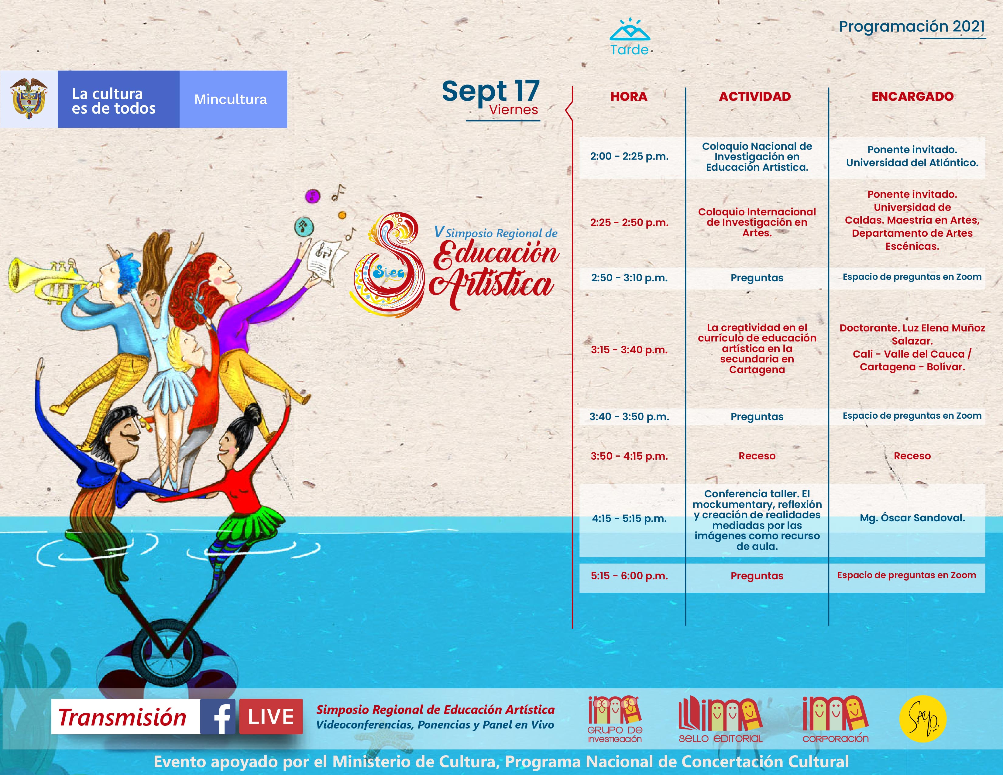La Corporación Ima, el Programa Nacional de Concertación Cultural del Ministerio de Cultura, y el grupo de Investigación IMA, realizaron el V Simposio Regional de Educación Artística de manera virtual, los días 15, 16, 17 y 18 de septiembre de 2021.