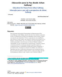 Este documento aborda parte del pensamiento de Educación para la Paz desarrollado por Johan Galtung, quien ha sido uno de sus máximos exponentes teóricos. El artículo hace la lectura de las principales obras del autor presentando y analizando sus categorías más importantes. Primero, se presenta el avance significativo dado al pasar de la paz negativa, que asumía la violencia como normal en el ser humano, a una paz positiva que ve la violencia como algo aprendido. Posteriormente aborda la paz positiva y las tres formas de violencia -directa, cultural y estructural-, así como sus dimensiones. Luego, el artículo se detiene en la teoría de las 3R, necesaria para entender los posibles caminos de construcción de paz en comunidades divididas por la guerra. Finalmente, se presenta la teoría y el método de resolución de conflictos. Se concluye la importancia que tiene el reflexionar teóricamente sobre la Educación para la paz, así como la necesidad de explorar caminos y releer a los autores que han hecho propuestas valiosas, ya que, en países como Colombia, la falta de resolución de conflictos en una sociedad polarizada hace cada vez más palpable la activación de nuevas y viejas violencias.