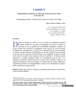 Durante la década de 1960 se vivió en Chile un importante momento de luchas sociales en los que el movimiento de la Nueva Canción se convirtió en la voz política de comunidades humildes, escenario en el que Violeta Parra sobresalió y permanece como una de las voces de mayor trascendencia y protagonismo a nivel local e internacional. En este documento se realiza una aproximación metodológica de carácter cualitativo para analizar el discurso de las canciones de Parra frente a las realidades sociales de Chile en los años 60 usando como categoría teórica de análisis la violencia directa, estructural y cultural propuesta desde la “Investigación para la Paz”. Los hallazgos encontrados demuestran que la música de la cantante chilena es un espacio de denuncia contra la violencia, así como lugar de crítica, reflexión y sensibilización frente a las desigualdades sociales de su comunidad, sin lugar a dudas, una música comprometida.
